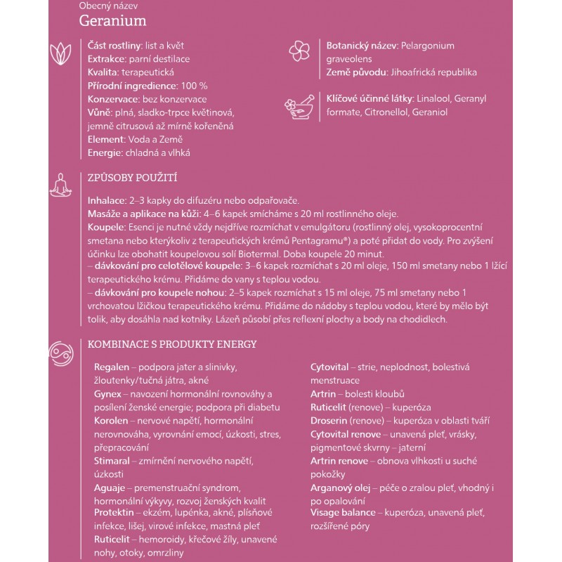 Geranium patří do skupiny tzv. „ženských“ esencí, otevírá cestu k přirozenému prožívání ženství, návratu do vlastní síly, k sobě.